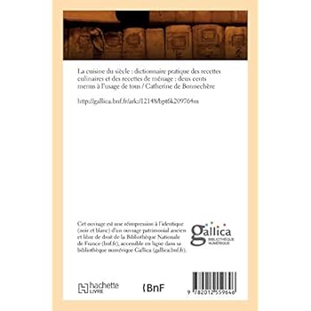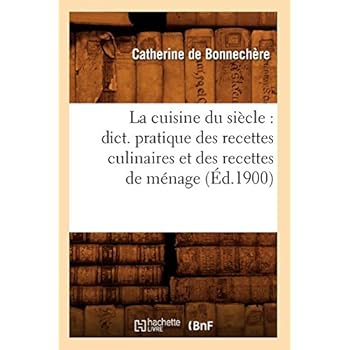 La cuisine du siècle : dictionnaire pratique des recettes culinaires et des recettes de ménage : deux cents menus à l'usage de tous / Catherine de BonnechèreDate de l'édition originale : 1900Sujet de l'ouvrage : Cuisine française -- 19e siècleCollection : Utile à tousLe présent ouvrage s'inscrit dans une politique de conservation patrimoniale des ouvrages de la littérature Française mise en place avec la BNF.HACHETTE LIVRE et la BNF proposent ainsi un catalogue de titres indisponibles, la BNF ayant numérisé ces œuvres et HACHETTE LIVRE les imprimant à la demande.Certains de ces ouvrages reflètent des courants de pensée caractéristiques de leur époque, mais qui seraient aujourd'hui jugés condamnables.Ils n'en appartiennent pas moins à l'histoire des idées en France et sont susceptibles de présenter un intérêt scientifique ou historique.Le sens de notre démarche éditoriale consiste ainsi à permettre l'accès à ces œuvres sans pour autant que nous en cautionnions en aucune façon le contenu.Pour plus d'informations, rendez-vous sur www.hachettebnf.fr