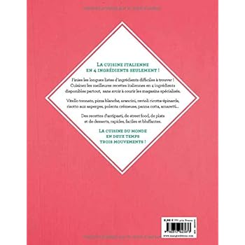 Finies les longues listes d’ingrédients difficiles à trouver ! Cuisinez les meilleures recettes italiennes en 4 ingrédients disponibles partout, sans avoir à courir les magasins spécialisés. Vitello tonnato, Crostini aux tomates confites, Pesto artichauts, Pizza blanche roquette et burrata, Focaccia, Arancini, Gnocchi à la romaine, Risotto alla milanese, Penne alla arrabiata, Ravioli au potiron, Saltimbocca, Panna cotta, Amaretto... Des recettes rapides, faciles et bluffantes ; une cuisine adorée des français.